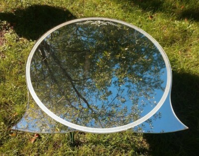 A LARGE Art Deco Vanity Mirror. Information technology has a lovely design engraved into the surface of the mirror featuring concentric rings and a stylized floral finial. ... more The engraved areas appear equally frosted glass, giving the mirror texture, depth, and character.