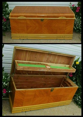 PAINTED Fine art DECO WATERF A LL CEDAR CHEST/ Trunk BY CAVALIER#3588 This wonderful Cedar Chest/Trunk is made out of solid woods. Solid Cedar forest, and Veneer. ... more This classic Breast in good original condition, and it has a low-cal/medium stain finish colour on the outside, encounter pictures, with mitt-painted accents on the surface. This Chest has a charming Art Deco Waterfall-style design. Meet pictures, and it was produced by Cavalier, a fine furniture manufacturer. This slice can be used every bit a Bench or equally a Breast/Trunk. See pictures, and it has a felt-lined shelf on the inside. The lock was taken out for rubber reasons. And it is but decorative every bit it is not working, see pictures. As it is currently set. This Chest cannot be locked. This beautiful Chest is secure and sturdy with some small-scale scratches here and at that place proper with its age& wear and tear. See pictures. There are some minor repairs and touch-ups on the painted accents, and in that location are some aging imperfections on the top, come across pictures. This Cedar Chest is unfinished on the dorsum side, see pictures, and it has some imperfections due to aging on the finish. The measurements are: summit=22" width=48 i/ 4" depth=19" approx. Please call up that vintage and antiquarian items will show some type of habiliment and minor imperfections they acquired through indelible time. This only add to the detail's amuse and character and authenticates the history of these pieces making them even more desirable and collectible. 3588 Check out my other items! Brand sure to add together me to your favorites list! Our contact numbers: 954-383-9962/ 954-383-9972 1-800-998-8523_ WE EXTEND ANTIQUE AND NEW BEDS FROM TWIN/Total SIZE TO Total/QUEEN& CALIFORNIA KING SIZE. BELOW You Take A BED EXTENDED FROM Total TO Male monarch WITH NEW SIDE RAILS AND NEW PLATFORM. Phone call OR EMAIL US FOR A FREE QUOTE EXTENDING Whatever BED. Full Size to Male monarch Size: ASK U.s. ABOUT OUR RE-FINISHING. RESTORATION AND UPHOLSTERY SERVICES, Note THAT ALL WORK IS DONE AT OUR OWN Shop AND ALL Furniture IS Mitt STRIPPED ON