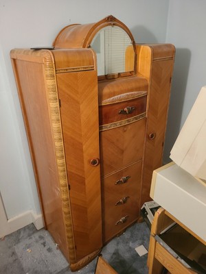 For sale is a Chifferobe Wardrobe Chiffonier from the Art Deco Period in the WaterfallStyle. This Chifferobe Wardroobe Cabinet is constructed of plywood ... more with a veneer facing that resembles the color of maplewood.